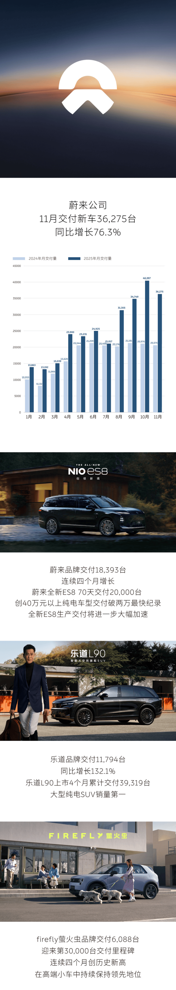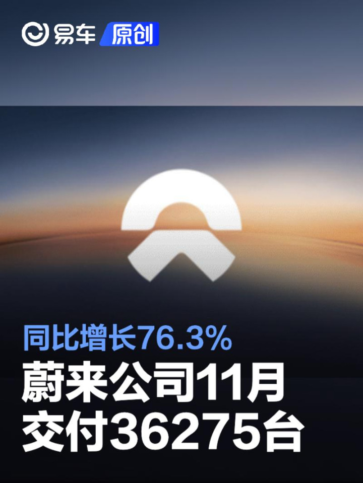 易车讯12月1日,蔚来公司公布最新销量数据。2025年11月,蔚来公司交付新车36,275台,同比增长76.3%。其中,蔚来品牌交付新车18,393台;乐道品牌交付新车11,794台;firefly萤火虫品牌交付新车6,088台。